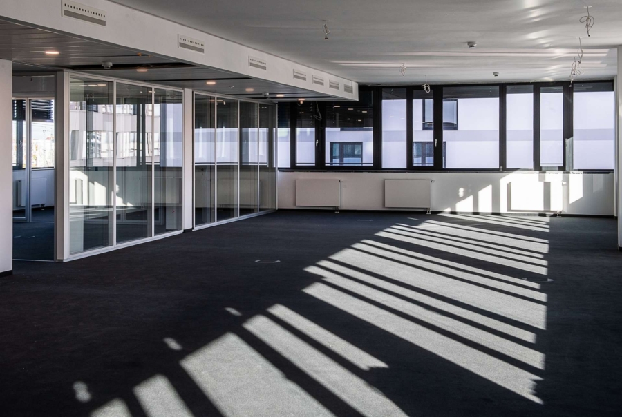 Bürobereiche mit offenem Grundriss, die sich flexibel als Großraumbüro nutzen oder in kleinere Einheiten unterteilen lassen. Die Fläche wird durch